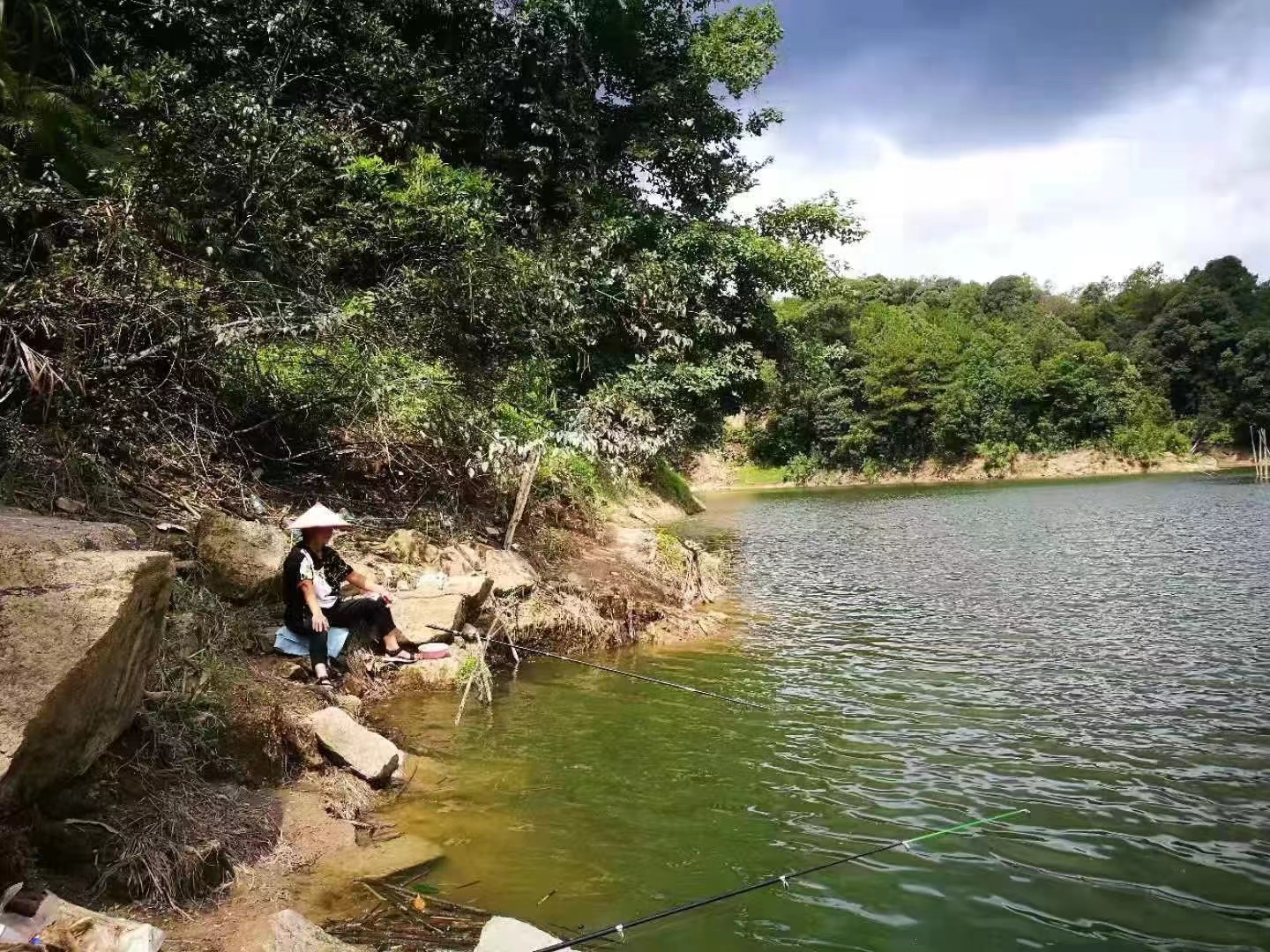 我在码头左侧的杨梅树下选妥位置,支起钓台,撑开太阳伞,取出一根5.4米长的鱼竿,安装妥钓线,测下水深并调好漂,拌好饵料,开始作钓。