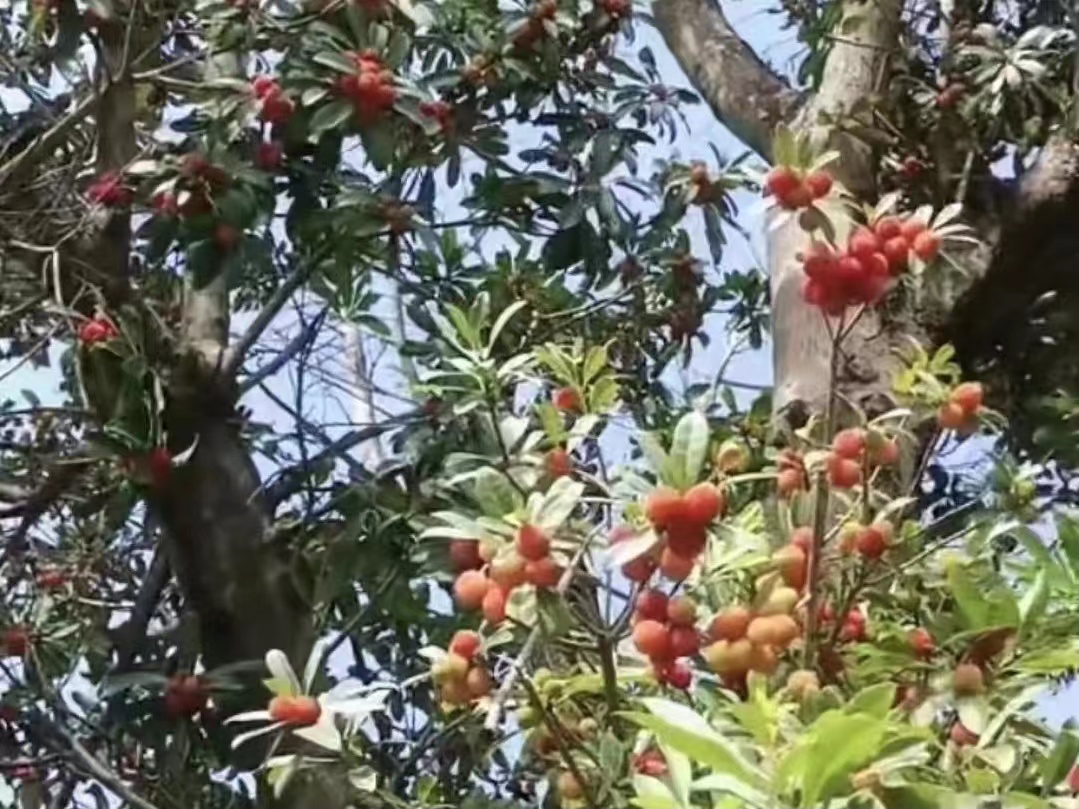 车沿着水泥路,由村东头开到村西面的湖边一处草坪停住。我下得车,驮着钓具包,在湖边寻找合适的钓位。见草丛里有几条锈迹斑驳的船,再前走十几步有个码头,水泥台阶探入湖水,石墩上拴着两条小木船。码头左岸有几蔸婆娑的杨梅树,树下有尊大石头,刻有三个大字:杨梅渡。