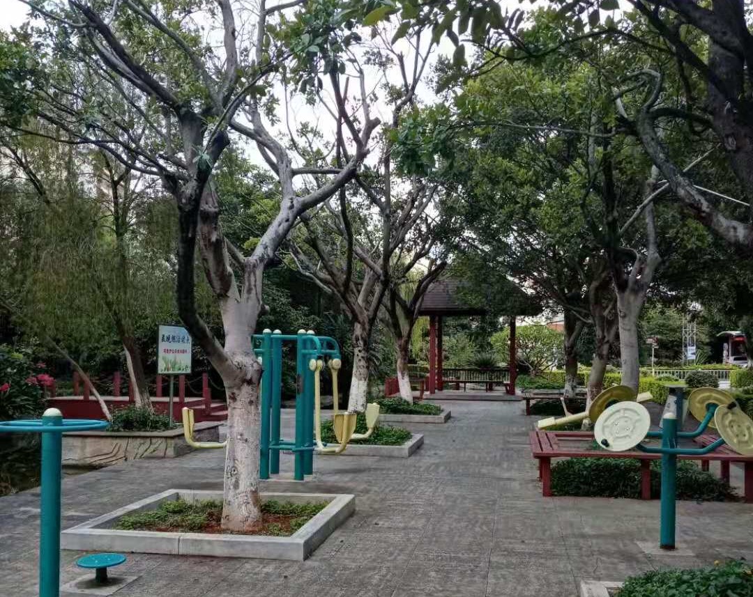 有全套的健身器材,还盖有一座小凉亭,供人们休息、闲谈,遮风避雨。