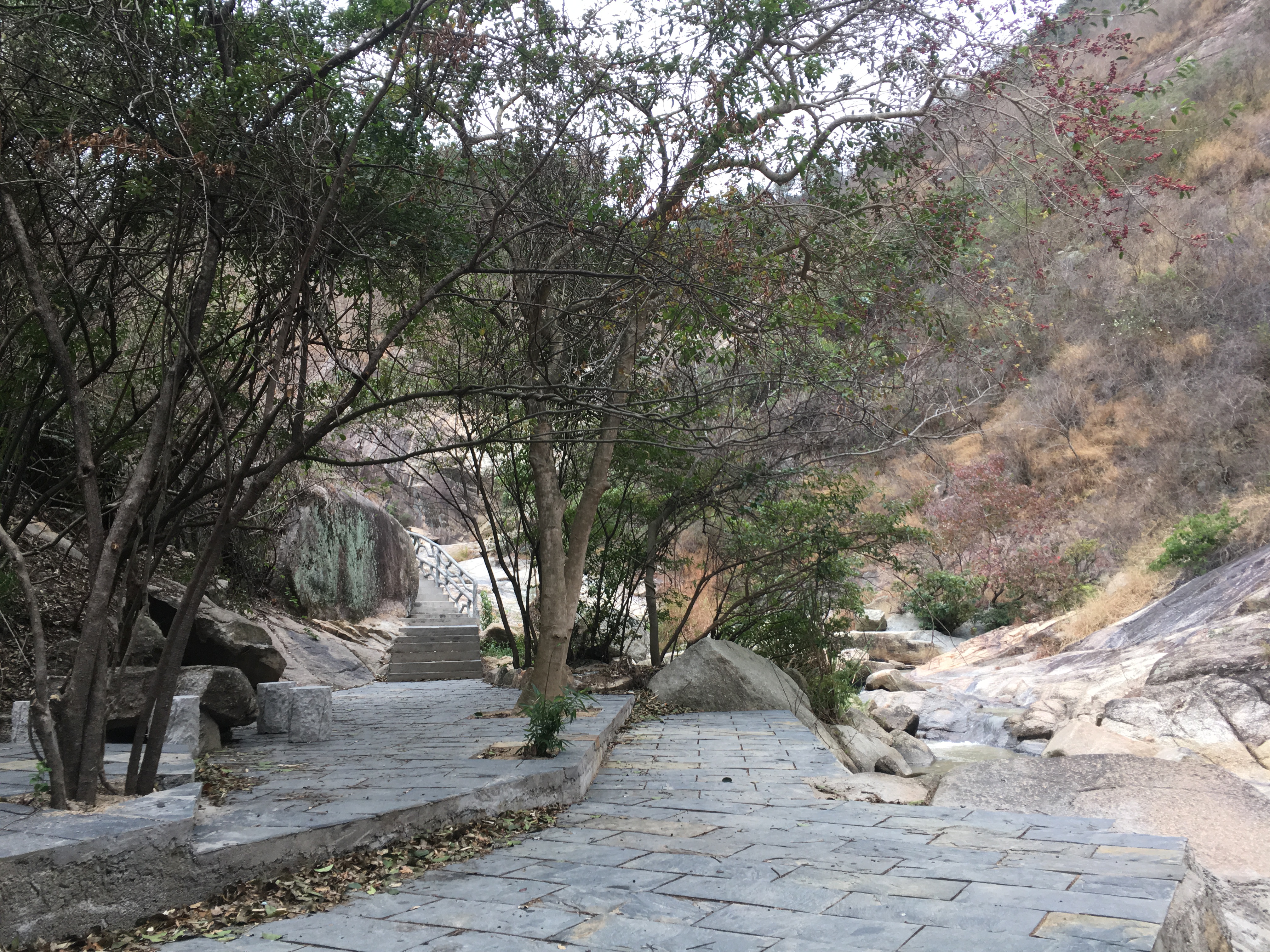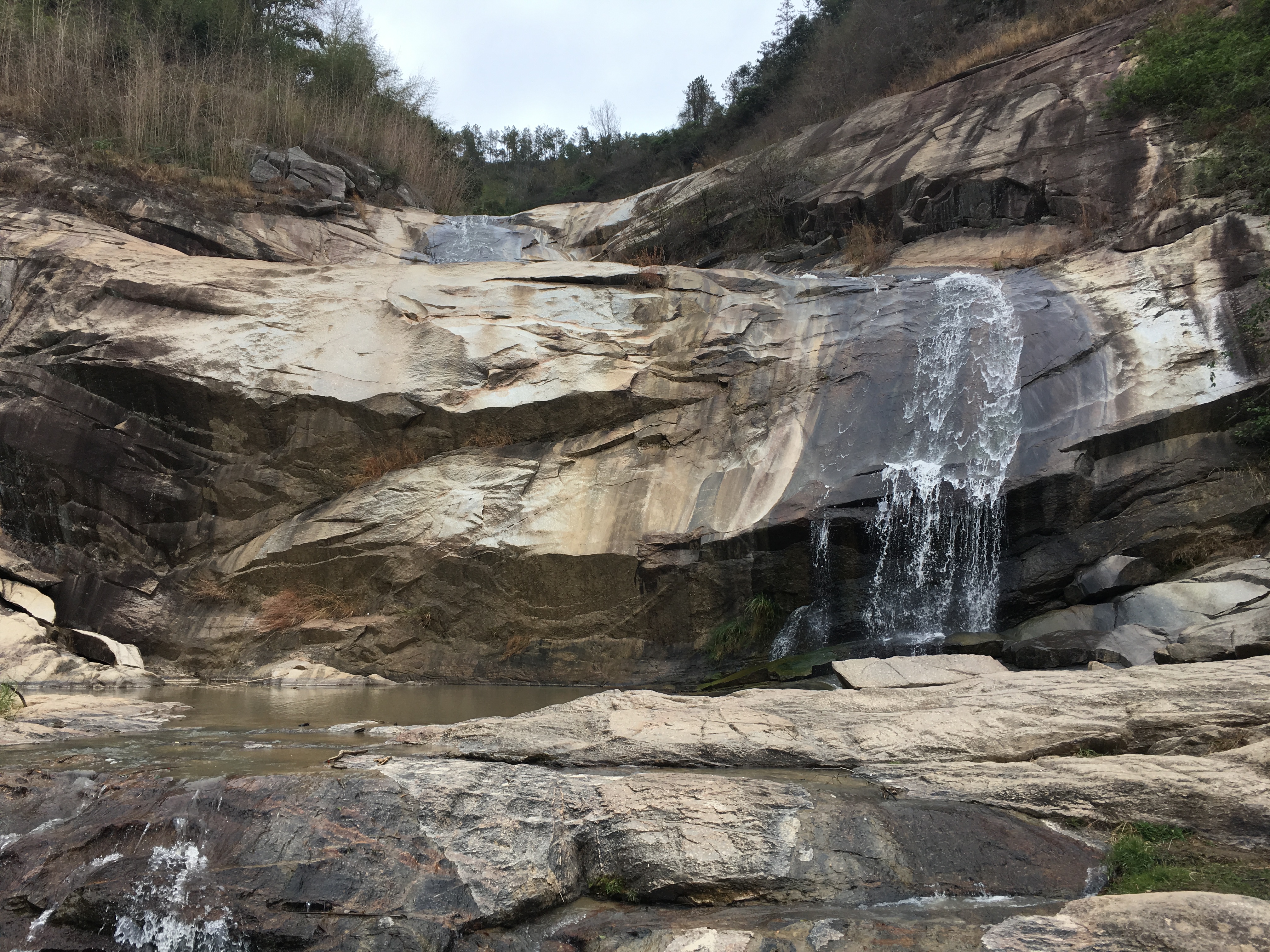山谷尽处,则是龙潭瀑布了。它由三级瀑布组成瀑布群,总落差70米,宽约5米。即使是在冬天枯水季节,上方仍有一挂水帘折叠而下,顿注深潭,潭水清澈,溢于潭坎,顺势前倾,奔于山谷。可以想见,若是雨丰水旺时节,这飞瀑该是何等气势,肯定是要如白练从天而下,大有“轻纱朱屏挂半帘,缥缈一线卷紫烟。水云深处龙翻腾,雷鼓嘈嘈震宇寰”之气魄。