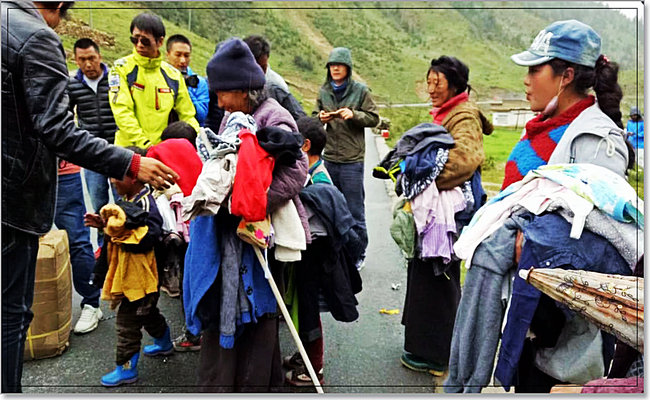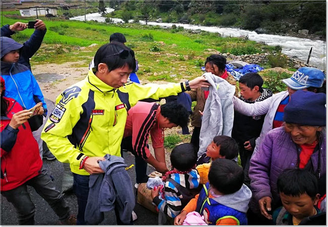 在西进的路途中,我们的车队总共到了两个这样的小村子里去做慈善。后来拿布跟我们队友解释说,藏区因为地理环境的原因,山高路远,很多地方还非常贫穷落后,特别是有一些道路不畅的偏远小村落,年轻力壮的都出去打工了,剩下一些老人小孩生活非常困难。康巴兄弟连的司机们就利用常年行走在川藏线上的便利优势,每年面向全国募捐衣物,然后把从全国各地募捐到的各类衣物分批分类送到需要的藏民手中,遇到年纪大的极需帮助的藏民,拿布还会另外给他们一些钱,切实地为他们解决了许多实际困难。
