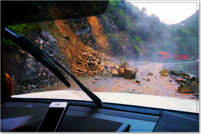 多多虽是和风细雨的性格,但是在关键时刻,却显现出了他的果敢和睿智。那天是九寨沟地震的第二天,318国道上的好几个县都受地震影响,阴雨不断,特别是在经过芒康大峡谷时,左边的山体时不时有小滚石落下。我们的车队走着走着,忽然就被迫停下,然后看见前面的车不断地往后退,退到一定程度才知道,前方有一路段被几块较大的落石给堵了,并且还有滚石的可能。要知道经过这里的可不止我们一个车队,还有好多工程车和其他进出西藏的车队呢。就在我们都以为这下惨了,一定会堵一天了,都沮丧得不行时,只见多多瞄准山体较稳定的时机,带领几个司机冲到落石旁边,奋力将那几块落石给推到路边,清理出了一条道路,然后指挥着车辆一辆辆安全地通过。从遇到险情到排除障碍,只用了二十来分钟时间,我们的车队就顺利通过,踏上了柳暗花明的旅程。