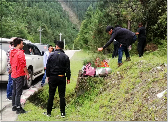 这一事件让我们觉得老大是个“狠角色”,虽是管理规范,但也有点不通情理,不留情面。不过后面发生的事情却证明老大虽是“铁汉”,更有“柔情”的一面。记得在即将进入“通麦天险”的一段路上,既不是观景区也不是休息区,可我们的车队突然就靠边停了下来,只见拿布老大从领头车上下来,径直走到两位肩扛手挑着几大袋行囊前往拉萨朝圣的老妇人面前,跟她们低语了几句,便从她们手上接过行囊,放到我们车队的后备箱里,然后我们的车队继续前行。直到过了通麦天险,到了一段平缓的道路上,我们的车队又靠边停下,拿布老大再把那些行囊全部搬到路边用塑料纸铺好的一块大石头上,掰了几棵松枝盖在上面,做好标记之后,我们的车队才再次出发。