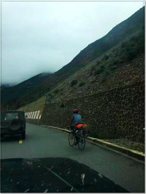 和我们不一样,有的人采用的是另一种方式来拥抱雪域美景,那就是“徒步”和“骑行”的人们。我们的车队每一天都会与他们擦肩而过,看见他们每一个人都带着一个大背包,或是蹬着自行车艰难爬坡,或是弓背弯腰缓步前行,我由衷地打心眼里佩服他们,不管他们是“穷游”还是为了挑战自我,他们朝着圣地拉萨前进的目标是明确的,也是笃定的。曾经看到过一首诗《献给徒步(骑行)在318国道上的人》:随着暮色渐沉/天地染墨/行走整天的影子/终于开始消融……它是这条路上绝不屈服的斗士/身上写着战斗……这是一道流动的风景/这是一场对灵魂的淬炼……的确,他们身上这一股坚韧和执著,令人敬佩,由衷为他们点赞!