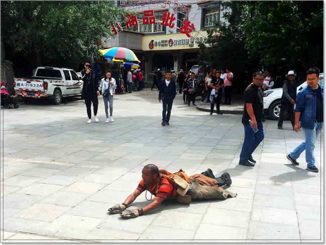 在抵达拉萨前,一直让我浮想联翩,总想着一探究竟的就是“磕长头”!过去在电影电视中晃过这样的镜头,但是一直没有亲眼见过,所以对它更加怀有一种神秘感和敬畏感。到达拉萨后,我终于近距离地看到了什么是“磕长头”:第一眼是在凌晨五点时分的拉萨街头,在小昭寺的门口,整条小巷寂静无比,没有人声,更没有车马声。我们要赶早去赴纳木措的约会,所以急急忙忙要穿过那条小巷去赶车。在经过小昭寺门口时,忽然听见了一声沉重的“噗——”声,转头望去,一名身著藏服的男子正匍匐在地,双手向前直伸,整个身子都平贴在地面上,我们看着他站起身,双手举过头顶,慢慢合十在胸前,然后双手前伸的同时,身子再一次扑向地面,又是一声长长的、重重的“噗——”声。这种因为身体与地面摩擦而产生的声音在漆黑的小巷深处显得那么幽长又幽长,透着一股空灵的禅意……