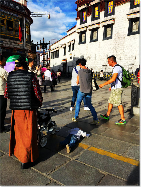 更加令我震撼的是在大昭寺后面的八廓街头看见的一个小男孩,约摸三岁左右,他在奶奶的陪同下,一步一磕,一磕一念,满脸稚气可眼神里却透着佛的意志,无比笃定,无比虔诚!