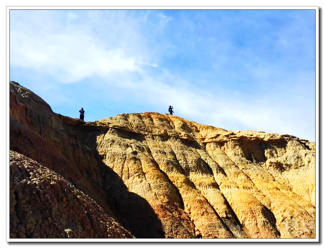这些五彩的岩层高低错落,造型各异,色彩缤纷,娇艳妩媚!我想,这不会是当年女娲娘娘用来补天时的五彩石遗落在人间,化作了这一片神奇的五彩滩吧!与五彩滩有所不同,五彩城的山丘要高大得多。据说早在侏罗纪时代,这里沉积着很厚的煤层,历经风蚀雨剥,煤层表面的沙石被冲蚀殆尽,再经过曝晒或是雷击起火,煤层最后被燃尽,烧结岩堆积成小山丘。