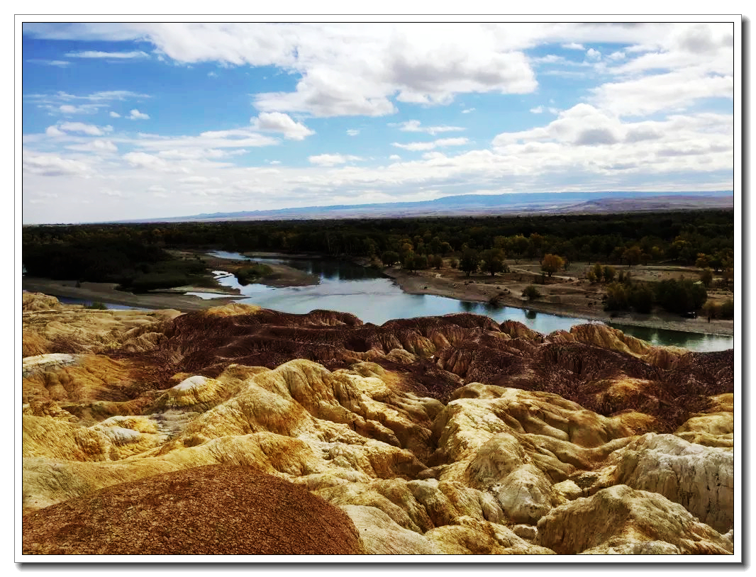 南岸是葱郁青翠的河谷风光,绿树葳蕤,连绵成林;北岸却是沟壑纵横,状如古堡、怪兽、峰丛等奇形怪状的小山丘,一个连着一个,肆意地裸露出它们那红色的、绿色的、紫色的、黄色的、白色的、黑色的五彩斑澜的身体。