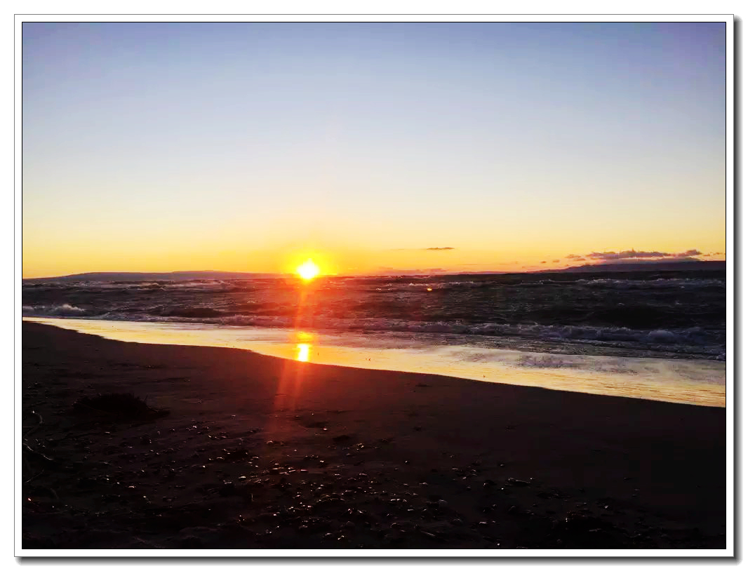 我们欢呼着冲向岸边,在落日的映照下,一望无际如大海般广阔的湖面,像被谁撒了一层金子般闪闪发光,微风推着水面涌起了一层层微浪,太阳又红又大,在水天相接处露出灿烂的笑脸。我们争相在“大海”边拍照,湛蓝且无边无际的湖水,火红而硕大无比的落日,我们以为这就是乌伦古湖带给我们最大气的礼物了。