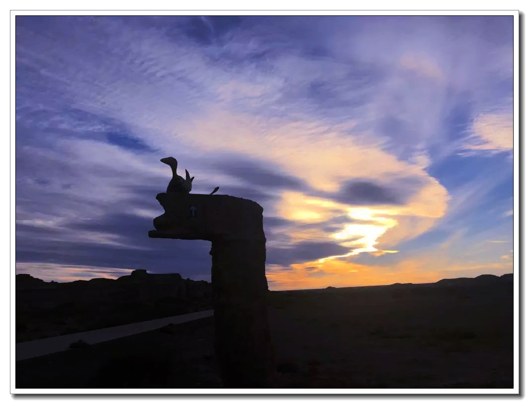 余晖下光影重重的魔鬼城夕阳西下,下了一天的小雨到这时却云开雾散,火红的太阳在西边的地平线上正努力挣脱乌云的枷锁,放射出耀眼的光芒。这时的魔鬼城,还真有一点点“鬼影重重”的感觉。
