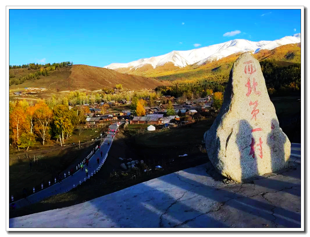 夕阳西下,站在“白哈巴村”巨形石碑旁,小小村落尽收眼底,村民居住的小木屋和圈养牲畜的栅栏错落有致地散布在松林和桦林之中,炊烟袅袅,马蹄声声,鸡犬相闻,牛羊满坡,一幅人与自然和谐共处的秀美画卷华丽丽地展现在你的面前。