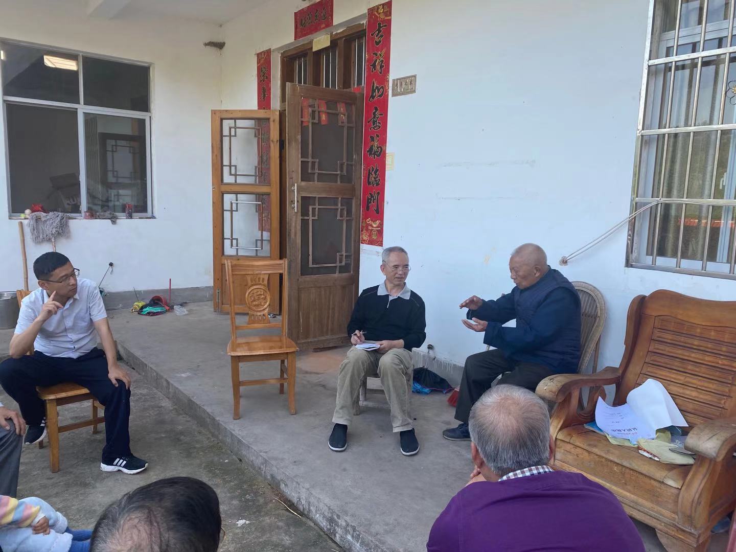 我们一行对莲塘三姓祠很感兴趣,决定前去实地考察。途中,我们随王书记先去了下大塘头组,在大塘头组见到了一位98岁高龄的老前辈——黄达人先生。