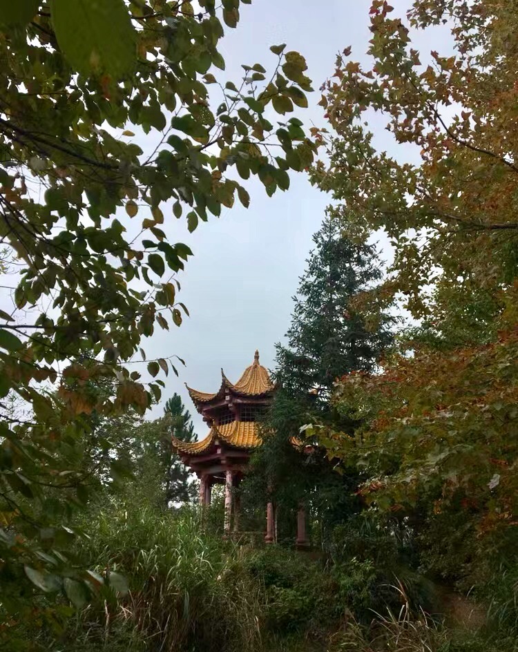走过玉带桥,有一些台阶弯弯地向上延伸着,层层叠叠的落叶铺满了石阶,石阶上也撒落着一些野果子。我拾级而上,见不远处是一座小亭子隐藏在山林树木间,大约是当地政府后来新修缮的。