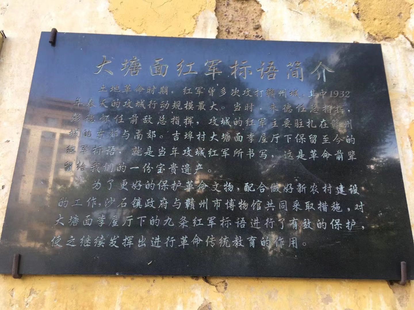 为了更好的保护革命文物,同时结合新农村建设工作,沙石镇政府与赣州市博物馆共同采取措施,对大塘面组李屋厅下的九条红军标语进行了有效的保护,建设有红军标语基地。