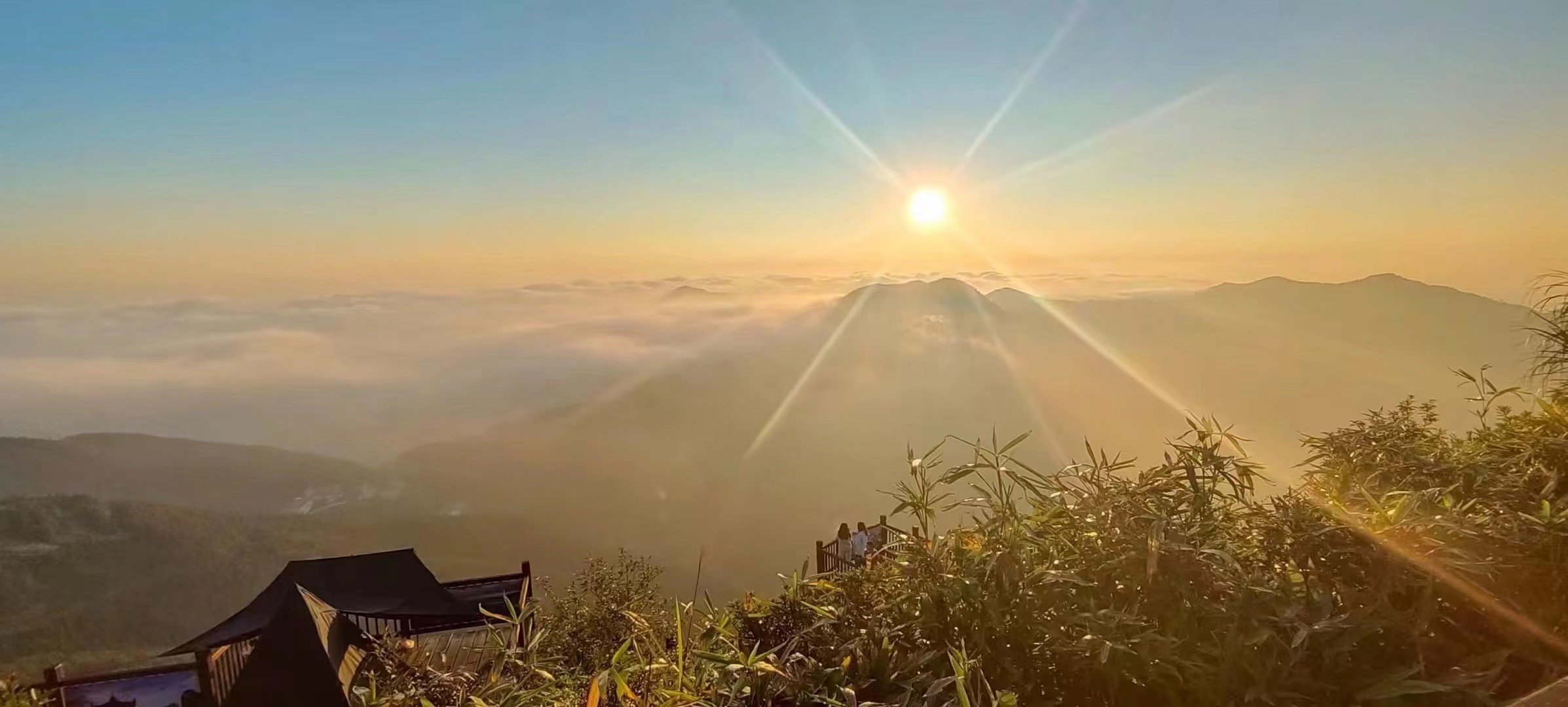 我噗之一笑,当做对他的赞许了。我们转了一圈,又爬上了山顶比较高的栈道,选择好了等待日出的最好位置。我们俯瞰云层底下还未苏醒的小山村,这些小山村,似乎跟我们一样也在等待着那喷薄而出的光芒,来唤醒他们沉睡的梦!